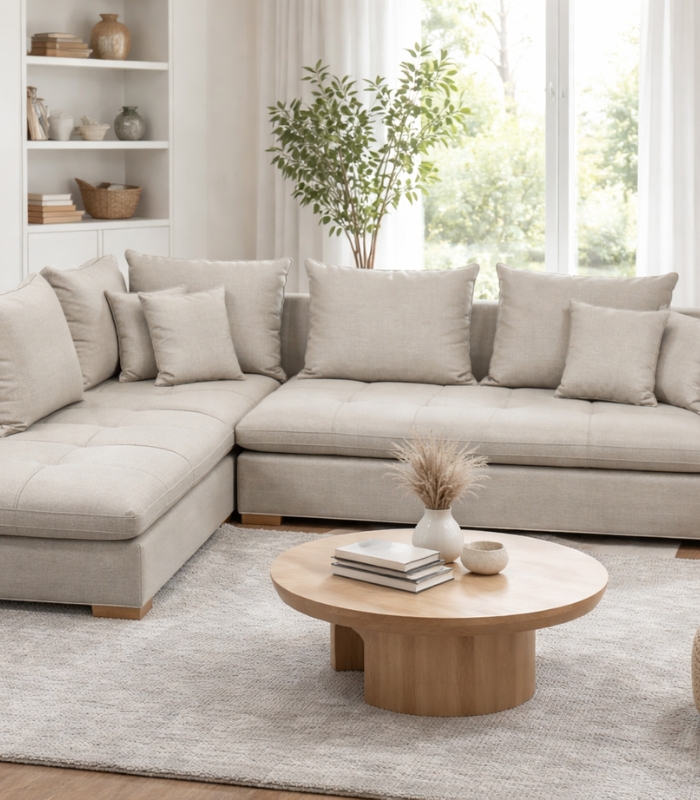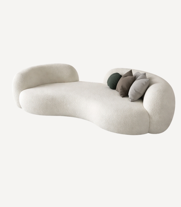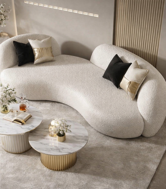 Lignes arrondies, tissu lumineux et confort enveloppant pour un intérieur contemporain et raffiné.